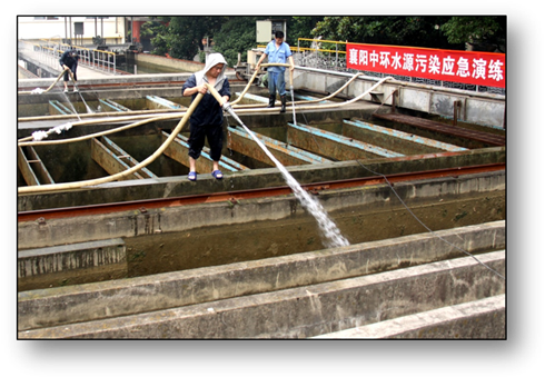 5月28日上午,襄阳中环水务米公水厂开展了一场“水源污染应急演练”。“演练”通过该厂位“汉江取水口水源地突遭不明原因污染”,城市供水“被迫紧急停止” …… 。图为演练过程中,米公水厂员工利用多支高压水枪,对水厂“被污染水池池面、管道” 等进行全面、彻底的清洗。“演练” 进一步提高了企业员工处置突发事件的思想意识和能力。