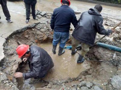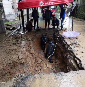 因爆管事件突发,抢修人员赶到现场时,水泥路面已塌陷出一个大坑,马路上到处是积水,天空还下着雨。为了尽快修好爆裂管道,在最短时间恢复供水,抢修人员不惧艰辛,不顾泥水和雨水的困扰,齐心协力、紧张有序地进行着漏点的抢修。经过近4个小时的奋力抢修,终于完成了玛丽医院DN400PE管修复工作,保障了群众正常用水。